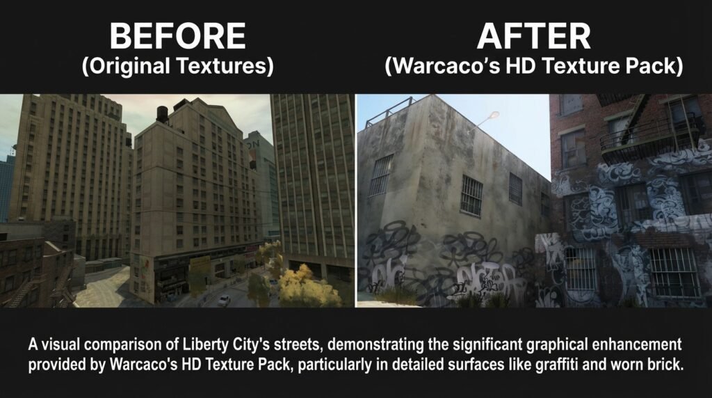 The first GTA 4 RTX Remix textures pack was released by modder Warcaco in December 2025. This 1.2GB pack dramatically improves roads, pavements, vehicles, and buildings throughout Liberty City.
