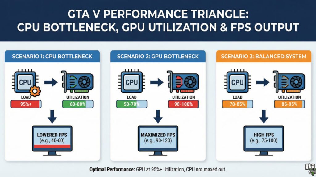 GTA V is notoriously CPU-intensive. The game world is massive, filled with AI-driven NPCs, traffic systems, and physics calculations that hammer your processor. If your CPU cannot feed frames to your GPU fast enough, your graphics card just waits around.