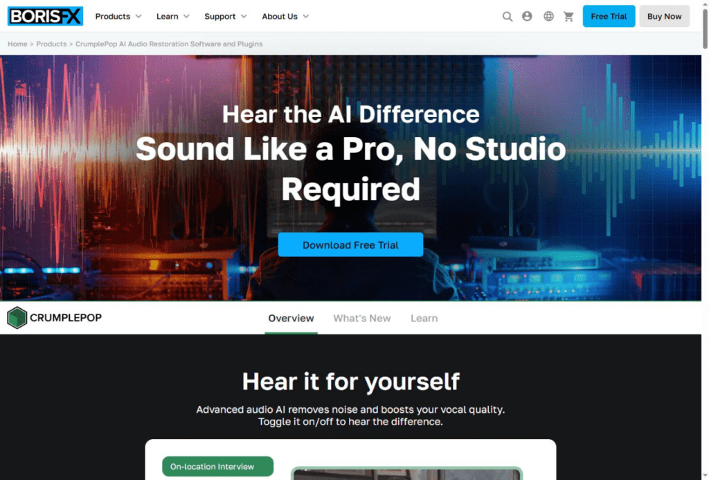 CrumplePop offers a suite of AI plugins (now owned by Boris FX) that plug directly into Premiere Pro, Audition, or Final Cut. They are famous for their simple interface.